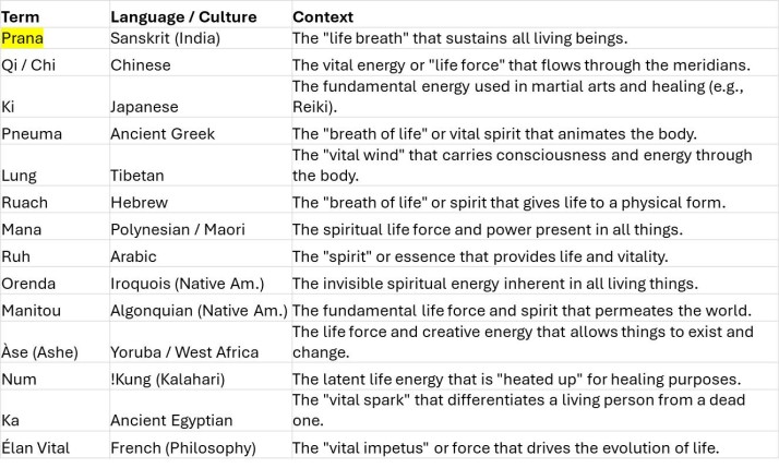 People ask me all the time, "what is Prana?" Well... it's actually a universally-recognized life force energy. There's a word for it in just about every language, as the chart below shows.